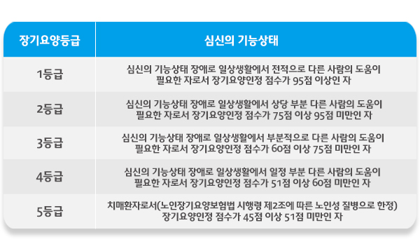 장기요양인정 점수를 기준으로 다음과 같은 5개 등급으로 등급판정을 합니다.